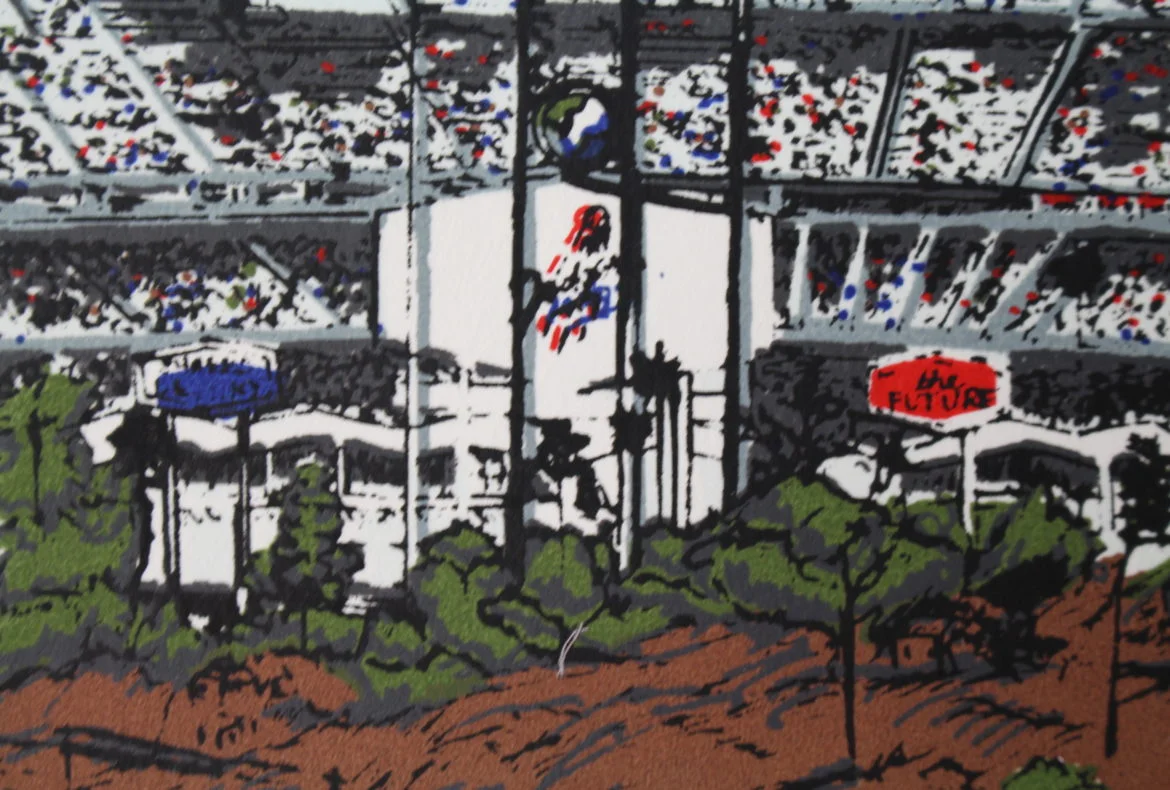 Some who remember Chavez Ravine and the story of families being displaced to make space for the stadium, are keeping that history alive and in conversation, such as Los Angeles based artist, Miyo Stevens-Gandara. Stevens-Gandara is drawing parallels between the historical accounts of the Chavez Ravine displacement from the past, with the present issue of gentrification and displacement facing communities, such as Boyle Heights. In her print, “Chavez Ravine”, she captures the history of the Dodger Stadium. “I’m not a huge baseball fan but I always wondered about that [Chavez Ravine] story, that landscape, that narrative. Every time I heard them talk about Chavez Ravine or a Dodger game or something, that had such weight to me, that name, that I always thought of the story. I wanted to create something that reminded us of displacement because it’s happening all over LA. So I thought I’d take something that everybody really loves, like the Dodgers; and use that as an entry point to talk about the history of that area, what happened, and how we shouldn’t do that [displace people] anymore,” says Miyo.