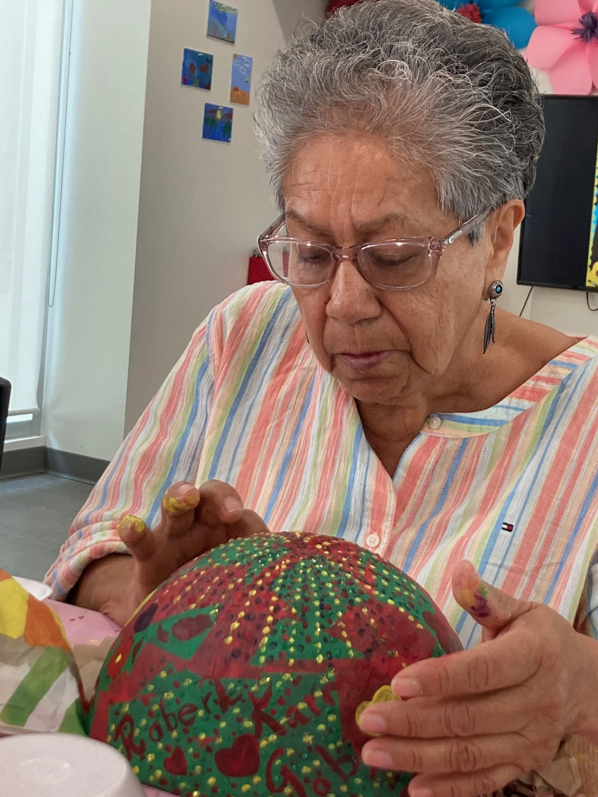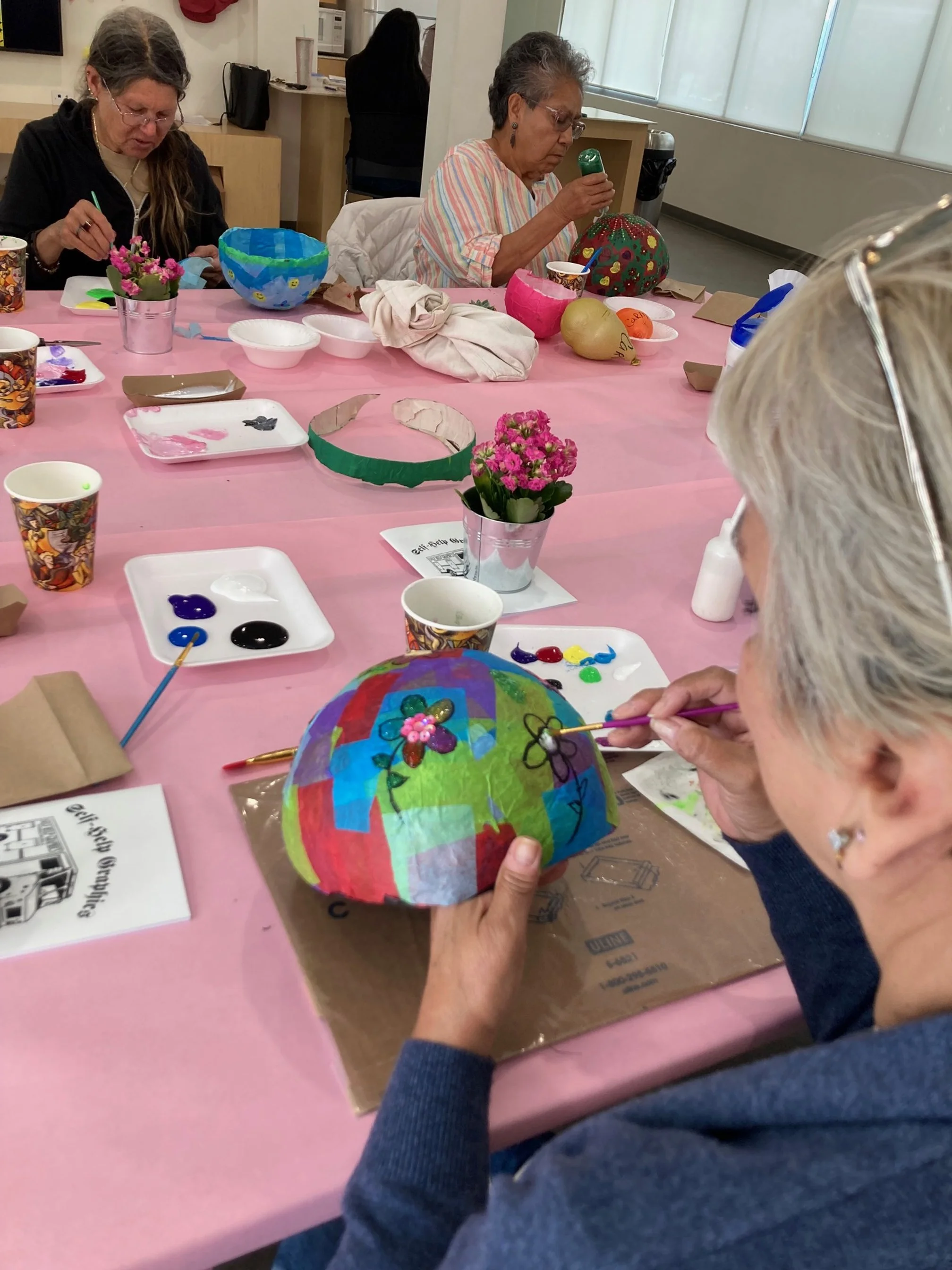 In this series, Martha taught participants the art of paper mache and how to create decorations, such as bowls, for the senior’s homes or common areas. Many of the seniors attending were familiar with paper mache in their own tradition or through the calavera paper mache workshops Self Help Graphics offers annually during the Day of the Dead season. Participants shared that they really appreciated the chance to learn new techniques and other ways to use this medium to express themselves.