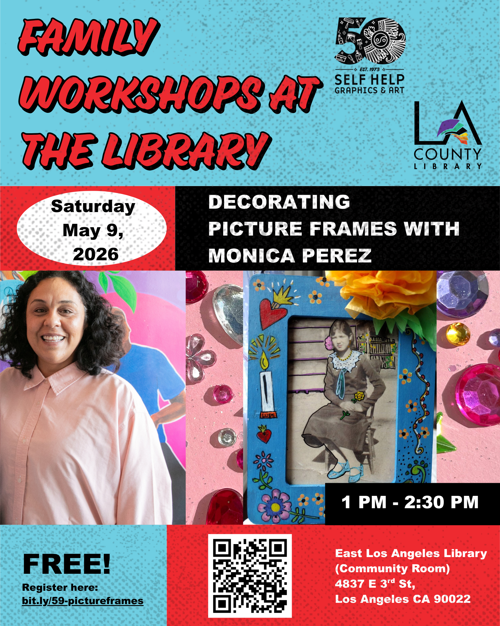 Self Help Graphics & Art’s monthly free Family Workshops are held at the East Los Angeles Library every second Saturday of the month in the Community Room. Limited public parking is available. The East Los Angeles County Library is located at 4837 E 3rd St, Los Angeles, CA 90022, directly across from the Metro E Line East LA Civic Center Station, at the intersection of 3rd Street and Mednik Avenue.